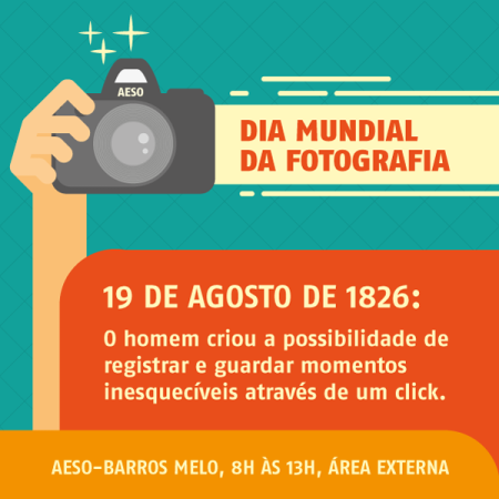 Dia 19 de agosto de 1826: o homem criou a possibilidade de registrar e guardar momentos inesquecíveis através de um click. Para comemorar o dia mundial da Fotografia, as Faculdades Integradas Barros Melo (Aeso) promovem uma manhã de palestras para entender a arte de capturar imagens. São eventos promovidos pelo curso de Fotografia da faculdade e acontecem no dia 19 de agosto.